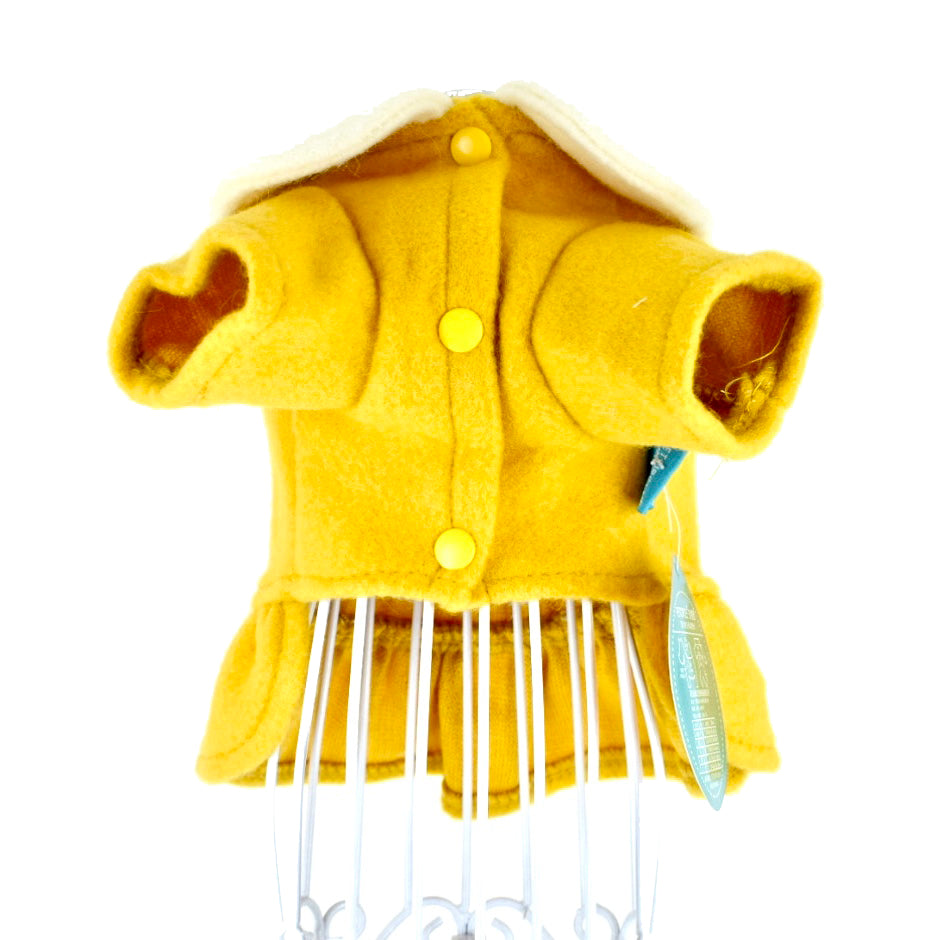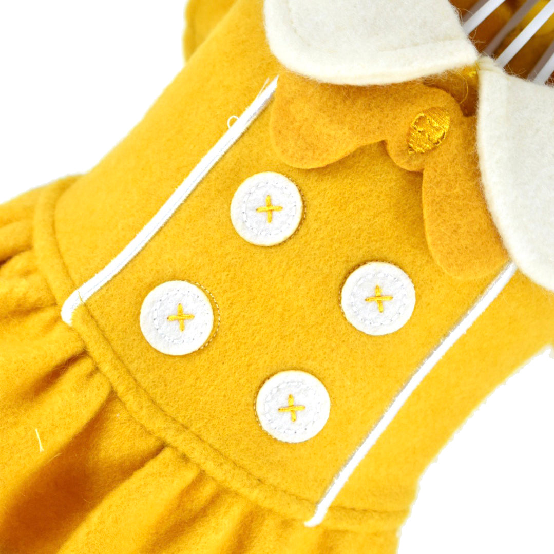 Vestido mostaza con broches de presión delanteros, detalle de moñito bordado, botones bordados. Sin forro.